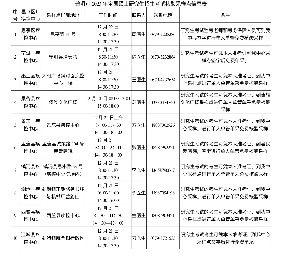 一、除在之前發(fā)布的《普洱市2023年全國碩士研究生招生考試考生告知書》中明確的核酸檢測(cè)點(diǎn)外,普洱市十縣區(qū)疾控中心也作為本次研考組考的定點(diǎn)檢測(cè)機(jī)構(gòu),于12月21日面向研考考生提供單人單管單采免費(fèi)核酸采樣服務(wù)。十縣區(qū)核酸采樣點(diǎn)詳細(xì)信息及工作時(shí)間詳見附件(注:思茅區(qū)疾控中心僅為研究生考試監(jiān)考教師和考務(wù)保障人員提供核酸采樣服務(wù))。