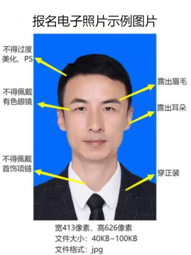 (1)本人近三個(gè)月內(nèi)正面、免冠、彩色(藍(lán)、紅、白色底)證件電子照片,照片必須清晰完整,著正裝,電子照片文件類型為jpg格式。電子照片標(biāo)準(zhǔn)尺寸為413像素(寬)×626像素(高)。電子照片文件大小為40KB≤文件大小≤100KB,照片必須清晰完整。證件照片頭部、肩部所占比例約五分之四。