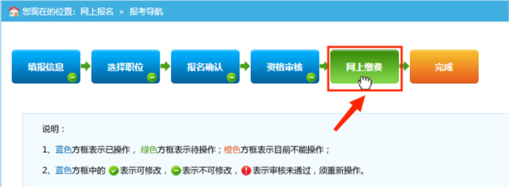 1.通過資格審查的報考者,點(diǎn)擊報考導(dǎo)航頁面“網(wǎng)上繳費(fèi)”按鈕進(jìn)入繳費(fèi)頁面。