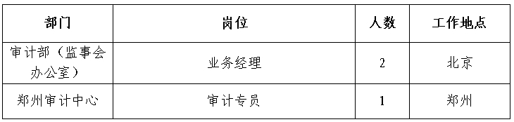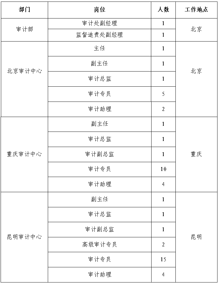 根據(jù)工作需要,經(jīng)研究決定,現(xiàn)面向社會(huì)公開(kāi)招聘方式補(bǔ)充集團(tuán)總部、有關(guān)單位審計(jì)人員65人。現(xiàn)將有關(guān)事項(xiàng)公告如下: