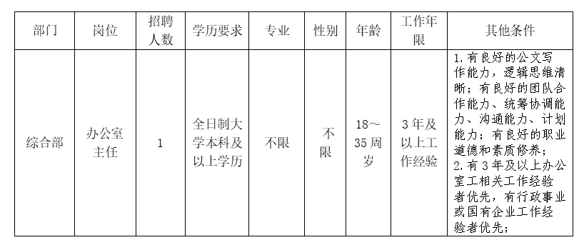 為加強(qiáng)人才隊(duì)伍建設(shè),優(yōu)化專技人員結(jié)構(gòu),結(jié)合公司工作實(shí)際,計(jì)劃公開招聘辦公室主任一職,為確保公開招聘工作順利進(jìn)行,現(xiàn)將有關(guān)事項(xiàng)公告如下: