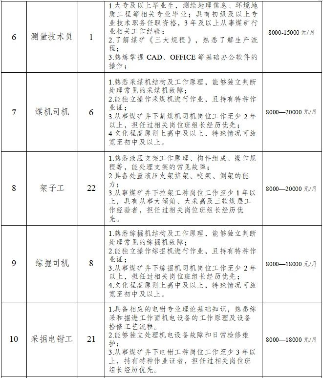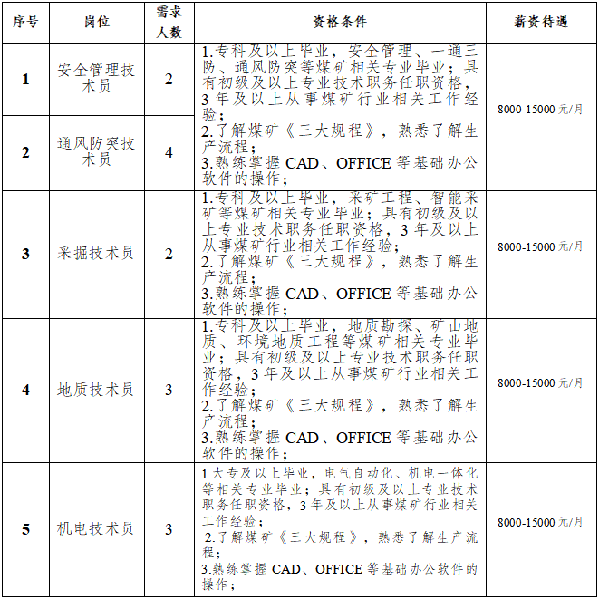 原則上年齡一般不超45周歲,特殊崗位技術(shù)人才可適當(dāng)放寬年齡至50周歲以內(nèi),但需個人確保到齡退休時,養(yǎng)老保險繳費(fèi)年限符合退休條件;持有井下相關(guān)操作技能等證書優(yōu)先考慮;身體健康,無相關(guān)職業(yè)禁忌癥。