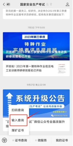 方式二:微信搜索并關(guān)注官方微信公眾號“國家安全生產(chǎn)考試”,點擊證書查詢→輸入查詢,查詢證書信息及復審時間。