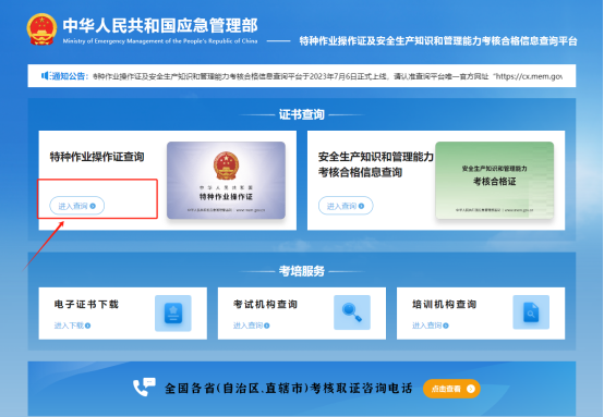 步驟 1:點擊“特種作業(yè)操作證及安全生產(chǎn)知識和管理能力考核合格信息查詢”。