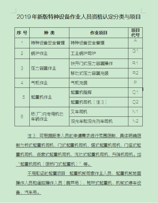 起重機(jī)指揮證(Q1)、橋式起重機(jī)司機(jī) (Q2)、門式起重機(jī)司機(jī)(2)、塔式起重機(jī)司機(jī)(Q2)、門座式起重機(jī)司機(jī)(Q2)、升降機(jī)司機(jī)(Q2)、流動式起重機(jī)司機(jī)(Q2)、纜索式起重機(jī)司機(jī) (Q2)。