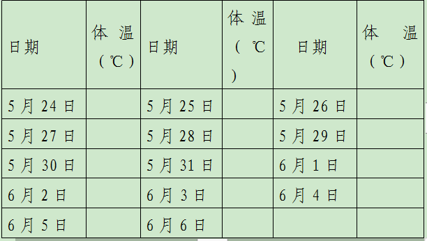備注:1.考生應(yīng)按上表每日測(cè)量體溫、進(jìn)行健康監(jiān)測(cè),如出現(xiàn)發(fā)熱、干咳、流涕等可疑癥狀應(yīng)及時(shí)就醫(yī)。2.入場(chǎng)攜帶本承諾書、核酸檢測(cè)證明連同彩打的云南健康碼、通信大數(shù)據(jù)行程卡交考點(diǎn)、考場(chǎng)查驗(yàn)。3.考生對(duì)所填內(nèi)容真實(shí)性負(fù)責(zé)。