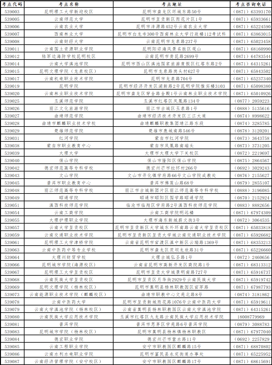 注:本次考試云南中醫(yī)藥中等專業(yè)學(xué)校、云南工程職業(yè)學(xué)院、昆明城市學(xué)院(楊林校區(qū))3個(gè)考點(diǎn)接受社會(huì)考生報(bào)考,其他考點(diǎn)只接受本校在校生報(bào)考。